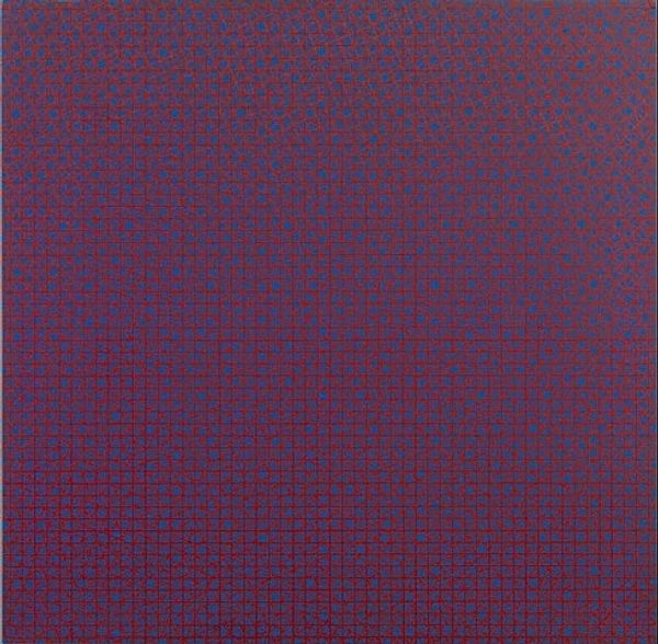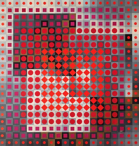 Editor: Here we have an untitled acrylic painting by Victor Vasarely. The canvas is filled with geometric shapes, mostly rectangles, in shades of red, blue and purple. The first word that comes to mind is hypnotic. What do you see in this piece? Curator: I see an attempt to unlock something fundamental about human perception, perhaps even consciousness. Vasarely, a key figure in Op Art, delves deep into how our minds create meaning from visual information. What feelings arise when you consider its patterns and colors? Editor: I think it's really exciting because it is both rigid and chaotic at the same time. Curator: Precisely! The rigidity gives a sense of order, while the color combinations and shifting orientations suggest dynamism. The simple rectangle takes on emotional, psychological and even spiritual resonance through its careful manipulation. Do you find any of the configurations create certain effects for you, maybe even an illusion of movement? Editor: Now that you point it out, in some parts it does look like the squares are shifting, or almost vibrating. Curator: Consider how this visual language resonates with other abstract and minimalist works. These symbols—simple geometric shapes repeated and altered—are part of our cultural memory. They have come to represent modernity, progress, even utopia. Yet, there's always a tension isn't there? Between order and chaos, control and freedom. Editor: I never thought of simple shapes as cultural symbols, but it makes sense in this context! Curator: Indeed, visual symbols are vessels that hold not just images but whole worlds of associations, memories and possibilities. This piece makes you aware of the power of abstraction. Editor: Looking at art this way definitely changes the way I look at abstraction, and it gives new meaning to seemingly basic imagery.