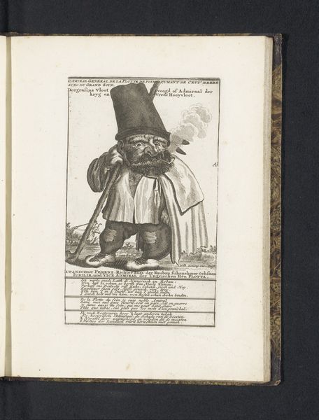This is a 1720 print entitled, 'The Spanish Dwarf Knight Castiliano Kikeboe' by Joost van Sassen. The composition is dominated by the figure of a dwarf, rendered with exaggerated features and a caricatured form, immediately evoking a sense of the grotesque. Van Sassen uses line and form to challenge established ideals of beauty and heroism. The figure's disproportionate body and exaggerated facial features destabilize traditional notions of the heroic knight. This distortion can be interpreted through the lens of post-structuralism, questioning fixed categories and values. The use of caricature serves as a visual sign, disrupting conventional representations of nobility and power. The seemingly simple lines of the engraving, therefore, function within a broader cultural discourse, reflecting on themes of power, representation, and the subversion of established norms. It’s through this formal analysis that we can appreciate how the print actively engages with and destabilizes cultural expectations.