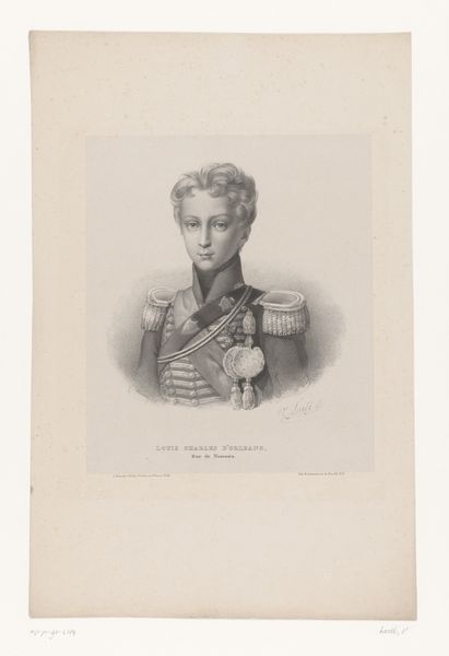 Curator: What a striking portrait! There's a palpable sense of melancholy emanating from this image. Editor: This is a print depicting Hertug Christian af Augustenborg, likely created sometime between 1723 and 1823. It resides here at the SMK, Statens Museum for Kunst. Curator: Ah, the Duke. He embodies a familiar archetype – the noble burdened by affairs of state, perhaps. The oval frame almost acts as a magnifying glass, isolating his gaze. It creates this strange distance, emphasizing the subject's position high above his peers. Editor: The neoclassical style, typical for depictions of nobility at the time, aims for that timeless sense of authority, doesn’t it? Everything down to his expertly tailored military garb speaks volumes. He seems very aware of his role. Curator: Precisely. Every button, every medal is intentionally placed for maximum impact. Notice the subtle background: The sky suggests a world far beyond his own sphere of influence, just outside his control, I suppose. And his stern face is almost impenetrable behind the stoicism required for positions like this. Editor: How fascinating that such a small, unassuming print could serve as propaganda or a carefully curated glimpse into the Augustenborg lineage and Danish political power. It speaks to the institution's ability to shape perceptions of historical figures through curated visuals. What do you make of that heavy military clothing? It looks incredibly cumbersome, if very attractive, of course. Curator: In visual symbolism, burden becomes a very important trope to signal the weight of their power, but also to elicit feelings of honor towards a member of a high society. Even today, people connect to images with these specific iconographic tropes and internalize values that were once linked to them. Editor: So it all connects to public image in a continuous circle: even the melancholy could be interpreted as empathy, or perhaps his stoicism as a signal for stability. It is easy to appreciate this image now knowing how intricate that game of visual meaning could be, while still appreciating the aesthetic appeal. Curator: A fascinating example of how portraiture encapsulates cultural values and anxieties! Editor: Indeed! I will have to look into more images from the SMK to trace their continuous presence in the representation of social and political roles.
