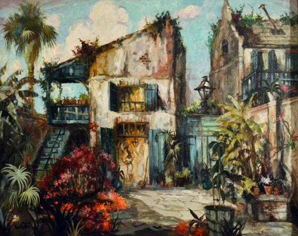 Editor: This oil painting, "Night at the Cervantes Theater in Tangier" by Consuelo Hernández, completed in 2001, really grabs my attention. It's almost haunting, yet beautiful. What do you see in this piece, considering it’s not just a depiction but a construction of place? Curator: It's fascinating to consider the materials used and the process behind this romanticized depiction. Hernández chooses oil paint, a historically valued medium often associated with permanence and prestige, to represent a rapidly changing urban landscape. Notice how the thick application and texture almost build the architecture. This relates directly to the economy of art-making: oil paint’s availability, cost, and the artist's choices around it all tell a story. Editor: That's interesting. I hadn't thought about the actual paint as contributing to the scene’s sense of solidity. So you're saying the materiality echoes the social and economic elements in play? Curator: Exactly. Look at the "Orientalist" style being evoked, a construction built in the 19th and early 20th century based on exoticised or colonial perspectives, then reproduced through material practice. Is this painting simply a continuation, or is Hernández commenting on its complex legacy and implications? The *how* of her painting, the visible labor, makes these questions present. Editor: I guess I hadn’t considered the orientalist aspect deeply enough; the idea that the materials contribute so significantly to these dialogues is eye-opening. It shows how the tangible intersects with social significance. Curator: Absolutely! I’ll certainly be contemplating Hernández's material choices within this work for a while.