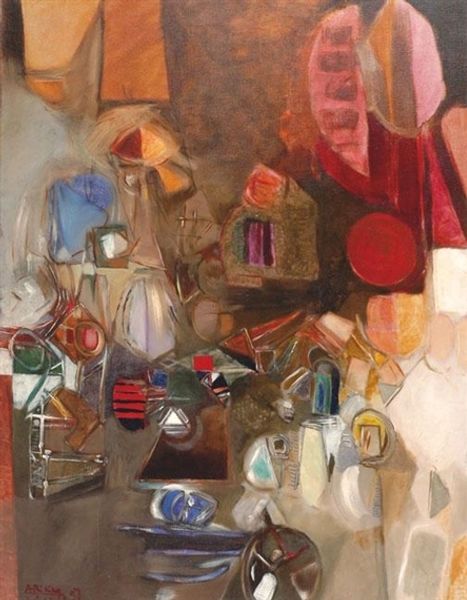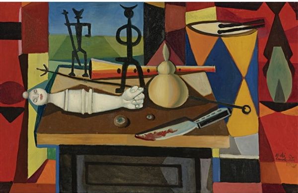 Karlo Zvirynsky made this painting, Small Things, using oil paint probably sometime in the mid-sixties. It's a still life, but with a very particular kind of looking happening. The textures and colours! Everything feels solid, grounded, because of that dark moody background. Yet, there's also this playful quality in the brushstrokes, a kind of naive joy in representing the mundane, like those needles sticking out of the plate! It's like he's inviting us to reconsider these everyday objects, to find beauty in their simplicity. The brushstrokes are visible, each mark a testament to the process, each colour decision contributing to the overall harmony. In a way, Zvirynsky reminds me of Giorgio Morandi, another artist who found endless inspiration in the humble still life. But where Morandi's work is quiet and contemplative, Zvirynsky's feels more exuberant, more alive. It's a reminder that art isn't about perfection; it's about exploration, about seeing the world in new and unexpected ways.