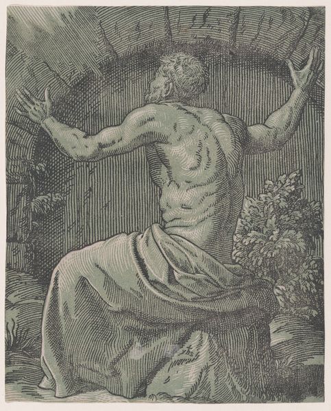 Curator: Taras Shevchenko created this poignant drawing, "St. Sebastian," in 1856 using charcoal and pencil. The artwork illustrates the iconic Christian martyr. Editor: There's such a compelling contrast between the soft, almost hazy rendering of the figure and the graphic detail of his bindings. The medium here, the monochromatic drawing itself, adds a layer of severity to this portrayal of agony. Curator: Shevchenko, deeply affected by his own suffering as a political exile, frequently invoked biblical and historical narratives to critique Tsarist oppression and explore themes of resistance and national identity. Presenting Saint Sebastian allows him to address the abuse and resilience of a persecuted figure. Editor: Absolutely, and the formal elements amplify that sense of suffering. Notice how Sebastian's upward gaze and outstretched arms create a vertical emphasis, contrasting with the horizontal of the arrow piercing his body, thus producing this tension. And even if this is a study on religion, this formal composition could be perceived without a religious interpretation. Curator: Considering Shevchenko’s Ukrainian background, his portrayal of Saint Sebastian has echoes with folk interpretations of faith under duress, reflecting on Ukraine's history and societal constraints during the Russian empire. Editor: His use of light and shadow is equally striking, isn't it? The highlights on Sebastian’s skin and his exposed chest contrast with the deep, shadowed background that seems to close in, tightening our attention on him. The overall rounded composition makes the drawing more harmonious. Curator: That harmonious round framing underscores how Shevchenko positioned religion as central to understanding Ukrainian identity within this era of geopolitical instability, a viewpoint certainly echoed throughout cultural expressions within the landscape and time. Editor: Indeed, a masterclass in expressing suffering and resistance, subtly and gracefully achieved. Curator: It’s hard not to view "St. Sebastian" as both a commentary on personal hardship and a reflection on society. Editor: And as a visual object, the play of shadow and the circular enclosure serve only to enhance the martyr’s palpable ordeal.