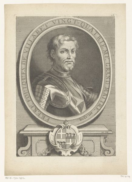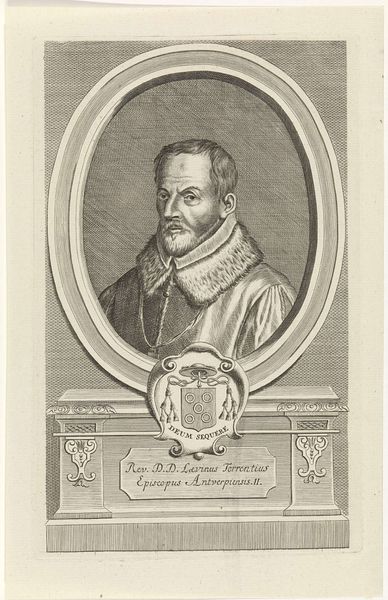 Curator: Look at this print, likely created between 1710 and 1725 by Jan Baptist Jongelinx. It’s a portrait of Johannes Miraeus. I find myself wondering about the choice of rendering such a man in monochrome; does it capture him, or freeze him? Editor: My first impression is of...dignified amusement. The eyes hint at a hidden smirk, even as the attire speaks of high office. And the scale is perfect, capturing the individual but hinting at his larger role. There is a sense of self-importance in this man but the image teeters on the brink of caricature, isn’t it funny? Curator: Oh, absolutely! Notice the elaborate coat of arms beneath the portrait – a visual testament to his lineage and power within the church. Those symbols would have been instantly recognizable to his contemporaries. Editor: Symbols layered upon symbols! The hat is, of course, an instant marker of his Bishopric, but the framing—that almost stage-like oval—presents him as an actor, or a figure to be watched, someone playing to an unseen audience. Curator: It’s fascinating how Jongelinx balances the realistic details of Miraeus’ face with the idealized setting. This piece lives in the Baroque style—full of dynamic curves and ornate flourishes. Even the lines creating the textures in his garments are meticulously done. Editor: What strikes me is the cultural memory embedded in portraiture itself. For centuries, these images served to preserve status, influence, and presence across time, especially for people who commissioned artworks like these. Today, the context might have evolved, yet the symbol lives on. Curator: Yes, exactly, it asks so many questions! Who was this man, really, beyond the office and the status? Was he truly devout, or more a shrewd politician? Was he compassionate? One can look for clues, in the soft etching lines in his face, and the twinkle of his eye, the slope of his collar. The artistry draws me into considering him, pondering his story, and finding my own narrative nestled inside his. Editor: Absolutely. Even though removed from that period, and unfamiliar with its societal and visual norms, through this etching, he peers out to us. These glimpses into the lives of people and society help the past merge with our perception of our reality.