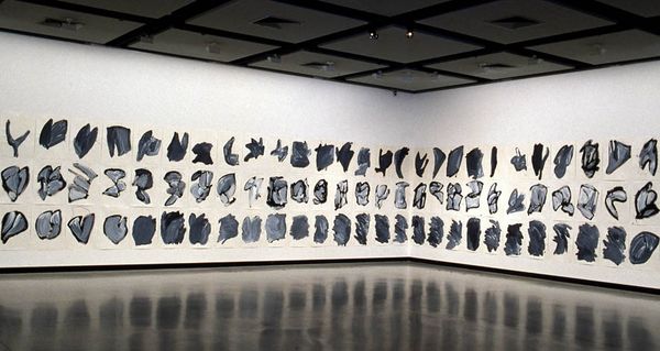 Editor: This sprawling silhouette by Kara Walker, titled "Grub for Sharks: A Concession to the Negro Populace," really captivates with its stark imagery. The figures feel like shadows from a fraught history. What narratives do you see unfolding in this work? Curator: The silhouettes evoke a history of minstrelsy and racist caricature, deeply embedded in the American psyche. Notice how Walker uses these familiar, yet disturbing, forms to confront our cultural memory of slavery and its aftermath. What emotions arise when you consider the title alongside these images? Editor: It definitely adds a layer of irony, almost a sardonic humor, to the whole scene. Curator: Precisely. The “grub” becomes a metaphor for the dehumanization and exploitation of a people, offered as a perverse form of sustenance. Walker compels us to confront uncomfortable truths about power, race, and representation. Editor: This makes me look at historical narratives in a completely new way. Curator: Indeed, art can be a mirror reflecting uncomfortable truths and inspiring change.