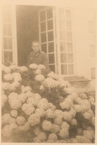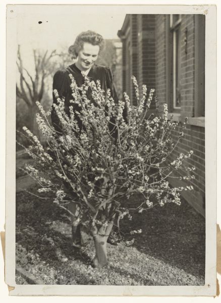 Editor: Here we have Keith Arnatt's photograph, "Gardeners." It's a black and white shot of a man beside a large hydrangea bush. The textures are incredible! What do you make of its composition? Curator: Look at the material reality here: the ordinary man, the brick, the overflowing hydrangeas. It highlights the everyday labor and materials that construct our social landscape. How does the photographic process itself contribute to this representation of normalcy? Editor: That's interesting. So it's not just about the image, but about how the image was made and what it represents? Curator: Exactly. The means of production and the subject matter converge, blurring the lines between high art and the mundane. Editor: I never considered that before. Thanks for opening my eyes to the details beyond the surface.