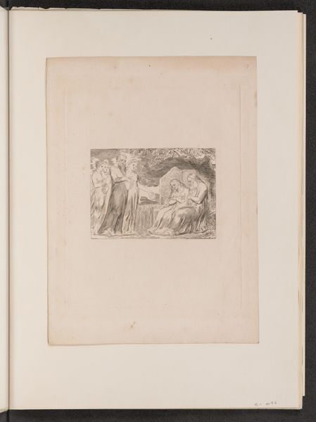 Curator: So, this delicate image here is William Blake’s "Thenot and Colinet," dating from around 1821. It's a print, though the fine detail gives it the feel of a drawing. What's your take as we approach it? Editor: Bleakly beautiful. The high contrast really sets a scene—austere, yet with a quiet kind of dignity, even pastoral innocence with the little gathering of sheep, doesn’t it? Curator: Indeed. The romantic landscape with that sun radiating behind is archetypical for Blake. Note the division in the composition. We have Thenot, on the left, appearing wizened and paternal and, on the right, Colinet. Both are shepherds, if a little unconventional in style. Editor: I notice that; Colinet seems propped up against some object. But, it looks awkward. Are the supports behind Colinet the same level of finish and material care of Thenot? What was his etching setup and production timeline? That impacts the social distribution. Curator: Blake was often working outside of traditional commission systems, following his own spiritual vision. These figures, taken from a series illustrating pastoral poems, are more archetypes than portraits. The heavy lines and stark contrasts evoke a primal scene of questioning, with youth contrasted with age. Editor: It’s this intense labor, combined with Blake’s own political vision that complicates how we see romanticism. I wonder how he selected the inks... there is a deep consideration to production costs and resources at hand to think of printing images in mass? The question about this work boils down to “Who does this reach, and how?”. Curator: Maybe not a "who" so much as a "why". Blake engaged with Milton, Dante… He saw himself as part of a lineage of visionaries wrestling with fundamental human questions. "Thenot and Colinet," I believe, is a visual meditation on the dialogue between experience and innocence, tradition and individual revelation. Editor: Alright, I am swayed. I still wish Blake expanded this out beyond this etching into an inexpensive mode of dissemination of this labor-intensive vision, if only more of England could have participated and accessed this exchange. Curator: True. However, maybe this concentration – Blake's intense engagement in the physical making of the print, the almost obsessive detail, infuses it with its very unique sense of artistic vision? Editor: It's hard to argue with the effect. Alright, I can sit with that, even with the material limits of what you are arguing. It's pretty compelling here.