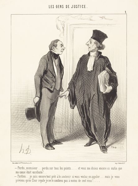 Curator: Here we have Honoré Daumier's lithograph, "Tiens... je ne te reconnaissais pas..." created in 1848. It's quite striking, isn't it? Editor: Immediately, I see two figures locked in what appears to be a very uncomfortable, possibly even antagonistic, social encounter. There is tension in the way they interact. It looks satirical. Curator: Oh, definitely! Daumier was a master of social satire. The title itself, which translates to "Good heavens!... I didn't recognize you...", hints at the insincerity of polite society. Editor: Yes, the theatrical poses underscore this. One figure gestures dramatically towards his chest, a gesture that appears excessive. Is he perhaps overstating a personal quality, feigning shock? The other looks rather austere in contrast, shrouded in what looks like disapproval. Curator: Precisely! Look at the stark difference in their expressions, exaggerated features— Daumier uses caricature to brilliant effect here. There is the bulbous nose and upturned chin of one figure, balanced against the rigid stature and almost comical long beard of the other. They exemplify different aspects of Parisian society at the time. Editor: And that landscape drawing in the background - is it a comment, do you think, about their "cultivated" tastes, or their pretensions toward culture and art? There's something terribly artificial in the interaction between the characters which is almost certainly being mirrored with this landscape picture, to highlight how it, too, is likely just an image, nothing of substance or true connection. Curator: Possibly a commentary on their aspirations! It seems the artwork almost bears witness to their affected interaction. Consider also, Daumier wasn't just making art for art's sake. These lithographs were often printed in newspapers; designed to reach a broad audience with their biting observations on the bourgeoisie. Editor: That gives a potent voice to his artistry! In terms of psychological underpinnings, there's an interesting game being played, here - what is concealed? What are these figures's desires? There are things here we can feel bubbling just beneath the surface that gives Daumier’s creation a continued appeal to a contemporary audience. It isn't merely a window to the past, but a reflection of persistent social patterns. Curator: It really makes you wonder about the story behind their strained encounter. It reminds us that some aspects of human interaction are, sadly, timeless! Editor: Indeed. Daumier gives us a glimpse of human relationships, in all their beauty and discomfit. It reveals truths about social interactions across time.