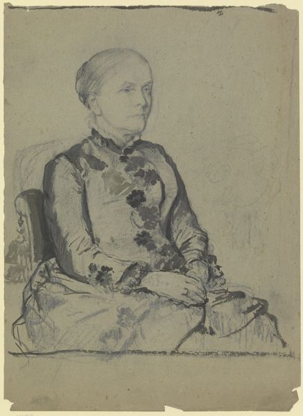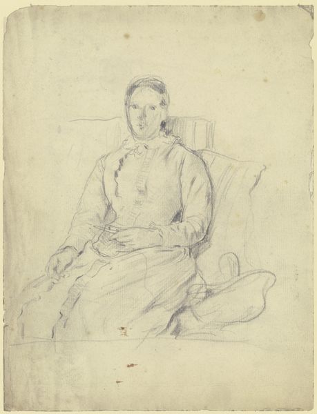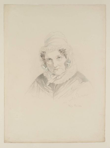 Curator: This is Paul-Jean Flandrin's "Portrait of the Marquise St. Hilaire." It's a pencil drawing, measuring about 37 by 29 centimeters, and we have it here at the Harvard Art Museums. Editor: The delicacy of the pencil work gives it a feeling of quiet contemplation. It also appears almost like a preliminary sketch rather than a finished presentation piece. Curator: Considering Flandrin's academic training, this work is interesting. The Marquise's garments, from the lace cuffs to her feathered head covering, signify a certain status, but the work itself shies away from lavish presentation. Editor: Perhaps the choice of medium speaks to a more intimate or personal portrayal of the subject. One wonders about the economic and social implications of choosing to depict nobility through such a humble medium, considering the usual expectations for painted portraiture. Curator: Absolutely. And the texture of the paper itself, visible beneath the pencil strokes, reminds us of the physical process of its creation. It blurs the line between portraiture and the artist's hand. Editor: It makes you think about the social exchange inherent in portrait commissions and the ways even an understated drawing could participate in constructing a public image. Curator: Precisely. It makes you think about the possibilities afforded by such simplicity. Editor: Indeed. A quiet rebellion, perhaps.