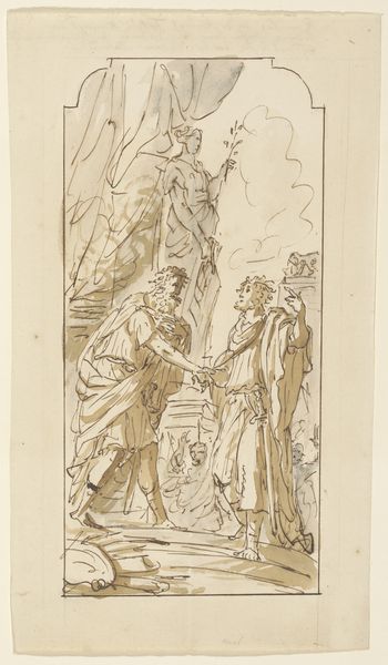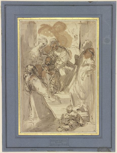 Bernardino Poccetti sketched 'The Visitation' using pen and brown ink with brown wash on laid paper sometime between 1548 and 1612. The Visitation, a subject frequently depicted in Italian Renaissance art, portrays the meeting of Mary and Elizabeth, both pregnant and carrying miraculous pregnancies. Poccetti's rendition offers a window into the social and religious climate of late 16th-century Italy. The Catholic Church, a significant patron of the arts, used such images to reinforce religious doctrine and promote piety among the faithful, especially during the Counter-Reformation. The setting, with its classical architectural elements, reflects the period's fascination with antiquity and underscores the sacred nature of the event. By examining Poccetti's artistic choices and the historical context in which he operated, we can gain insight into the complex interplay between art, religion, and society in Renaissance Italy. Further research into the patronage system and the artist's biography can shed light on his intentions and the broader cultural significance of the work.