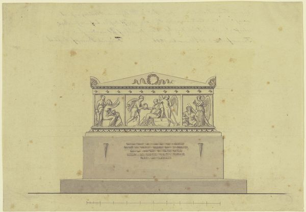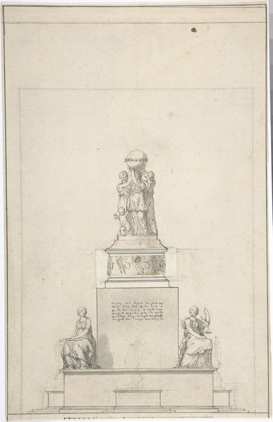 Curator: Here we have Charles Percier's design for the Fontaine Desaix, a print executed in pencil, pen, and brown ink on paper some time between 1764 and 1838. Editor: It strikes me as a somewhat severe proposal. The lines are so clean, almost aggressively geometric. What was its intended function? Curator: It was intended as a memorial, of course. This neoclassical design aimed to commemorate General Desaix, situating him within a pantheon of revolutionary heroes. The fountain blends patriotic symbolism with classical ideals. Think of it as a statement piece, reflecting France's aspiration to be seen as a modern, enlightened republic, building upon a Roman aesthetic of strength. Editor: The use of line is indeed compelling, and one can imagine how this drawing would become something made of stone. This layering and incising creates the appearance of great heft and structure, which communicates a social hierarchy rooted in these neoclassical materials. I'm curious about the technical execution of such a monumental structure in its final built form. Curator: The fountain as a civic symbol also intersects with questions of social order. This aesthetic was intended to reflect French cultural dominance as the design features references to Greco-Roman virtue. Desaix became an object lesson on bravery in the Republic at that time. Editor: Right, because beyond its artistic merits, this drawing is a proposal about labor, resources, and the very idea of permanence within political discourse. How were decisions about its material translation—stone type, methods of quarrying, the specialized labor of stonemasons—linked to its intended message? It looks as if the production required to enact this plan would need to be incredibly elaborate. Curator: Exactly! These pieces were potent signifiers in revolutionary France. And by studying it now, we consider how that vision attempted to inscribe itself into the very landscape of French identity. Editor: It's fascinating to consider the layered meanings inherent within this seemingly simple pencil drawing: from initial sketch to completed monument and social artifact. Curator: It underscores, in the end, the potent entanglement of politics and aesthetics during times of upheaval, doesn't it?