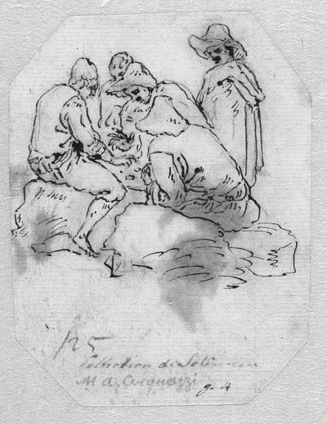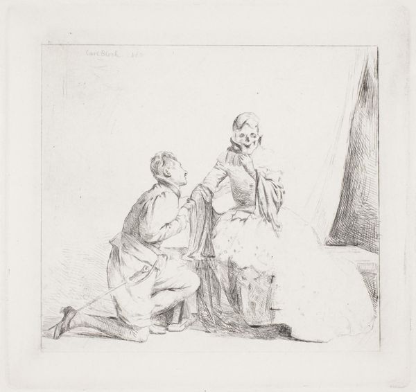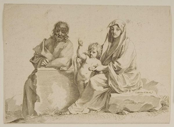 This is Giovanni Battista Piranesi’s etching of ‘The Blessed Virgin with Saints Peter and Paul.’ The composition immediately strikes you with its dynamic interplay of light and shadow. The figures are rendered with a loose, almost frenetic network of lines. Notice how Piranesi uses hatching and cross-hatching to build up the tonal values, creating depth and volume. The rapid, gestural lines give the scene a sense of immediacy, as if we're witnessing a fleeting moment. Consider the structural framework that underlies this apparent spontaneity. Piranesi employs a subtle geometry to organize the figures within the picture plane. The Virgin and Child form a stable apex, while the figures of Saints Peter and Paul introduce a sense of movement and dynamism. It destabilizes traditional notions of sacred representation. The etching technique itself—the sharp, biting lines—becomes a metaphor for a world in flux. The cultural codes once taken for granted are now subjected to a rigorous, questioning gaze.