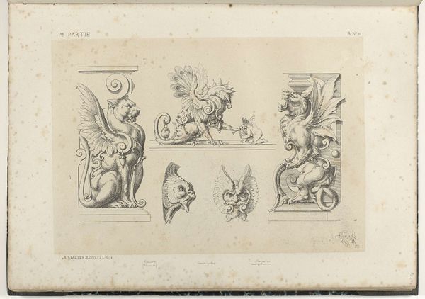 Editor: This engraving, "Lion and Dog Among Leafy Tendrils," dates back to 1866, and is attributed to Michel Liénard. The contrast between the regal lion and the docile dog is so striking. I'm curious, what's your take on how these animals are juxtaposed within such decorative foliage? Curator: Oh, I love where your eye went! For me, this print whispers of a time obsessed with heraldry and symbolism, wouldn't you agree? It feels almost like a page ripped from a book of fantastic beasts. See how Liénard doesn't just depict a lion and a dog, but elevates them with those swirling leaves, creating a narrative of contrasting characteristics? I feel almost like I'm looking into a dream. The dog appears gentle and approachable but perhaps not the most trustworthy or dependable as the lion seems. But the lion seems regal and steadfast and I could be wrong. Do you find these animals to also offer differing symbolic readings? Editor: That’s interesting! I didn’t initially think about the symbolic representation in such depth, rather their differing energy... your thoughts now encourage me to question my understanding. Curator: It makes me wonder whether Liénard intended the print to convey certain values, almost moral tales. Did Liénard seek to teach his viewers of these two animal temperaments. Or perhaps, he meant to reflect. That's what truly intrigues me about art, its ambiguity. Editor: Absolutely. It is the act of questioning, the ambiguity that makes the work alive. This whole conversation has encouraged me to look past the simple animal juxtapositions into a deeper context. Curator: Exactly! We've both been rewarded by our deeper attention! The next time I encounter these prints, I may consider Liénard's reflection into temperamental interpretations for this audience.