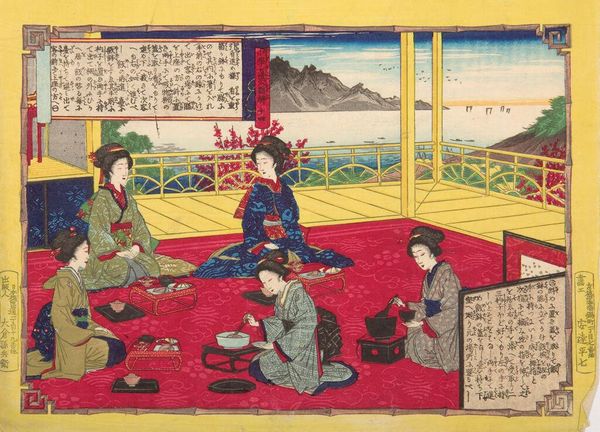 Curator: This is Adachi Ginkō's "Rules for the Department of Young Ladies," a woodblock print now housed at the Harvard Art Museums. The composition depicts several young women in what appears to be a domestic interior. Editor: It’s striking how flat the picture plane feels. And the artist uses color to create distinct spatial compartments that nonetheless feel oddly disconnected. Curator: The flattening is characteristic of ukiyo-e prints. Ginkō, working in the Meiji era, often explored themes of modernization and societal expectations. Editor: It’s interesting that such a modernizing theme comes in a format associated with the older Edo period. The rules, I imagine, are about how young women should behave? Curator: Precisely. The text at the top details conduct expected of women during that era. I find the layering of cultural messages quite complex here. Editor: Right—the medium itself acts as a commentary, contrasting tradition and change. I see both constraint and artistic freedom in this single image. Curator: It’s a testament to the complexities within Meiji-era art and society.