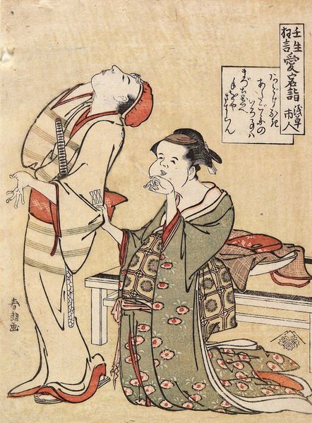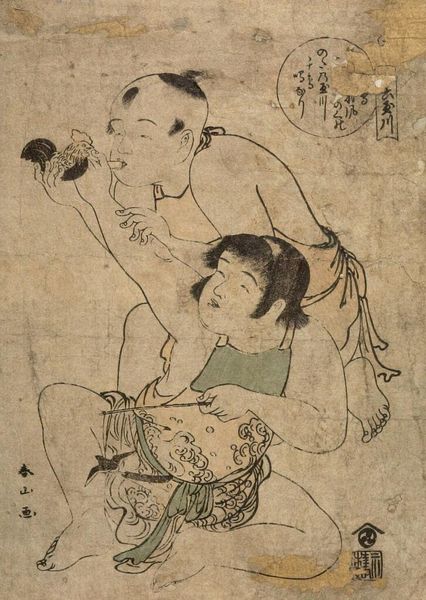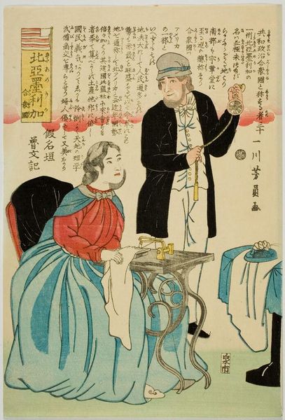 Editor: This print, titled "French Couple" by Utagawa Yoshitora, depicts a man and a woman, presumably French, in Western attire. It has a very curious, almost caricatured feel. What can you tell us about the cultural context in which it was created? Curator: This print reflects Japan's increasing engagement with the West during the late Edo and early Meiji periods. Notice how the artist attempts to represent Western fashion and hairstyles, but through a distinctly Japanese lens. How do you think the Japanese public perceived these images of foreigners? Editor: I imagine they were both fascinating and perhaps a little comical, judging by the man's exaggerated beard! It's interesting to consider how these images shaped Japanese perceptions of the West. Curator: Exactly! This print offers insight into how Japan grappled with foreign cultures and incorporated them into its own visual language. It's a powerful example of cultural exchange and the politics of representation.