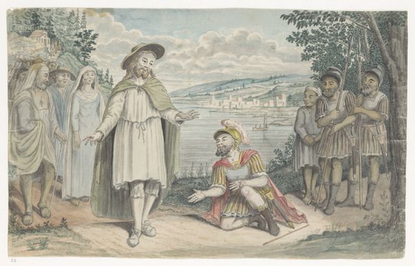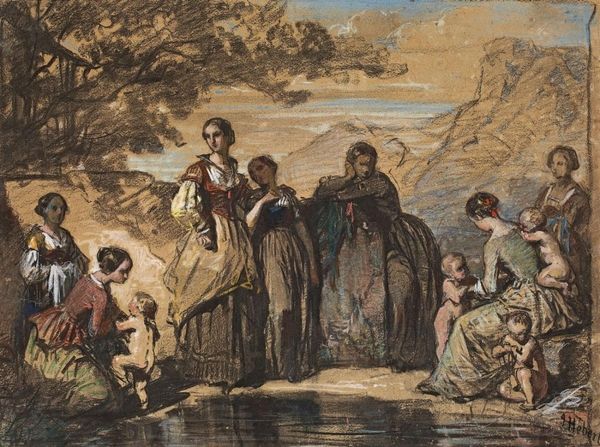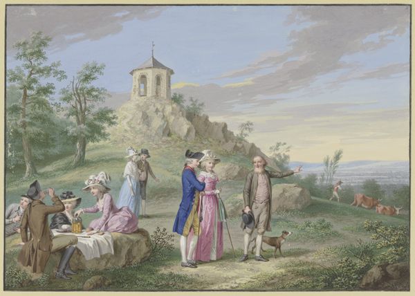 Johann Friedrich August Tischbein captured this scene of Italian country folk with pen and watercolour. The tambourines, the dancing woman, and the surrounding landscape evoke a sense of carefree abandon, a celebration of life. Consider the tambourine: an instrument that transcends mere musicality. Its rhythmic beat has, throughout history, been associated with ecstatic rituals and celebrations. From the ancient cults of Cybele and Dionysus, where the tambourine incited frenzied states of devotion, to its appearance in Renaissance festivals, its sound has been a call to communal ecstasy. The woman dancing embodies this spirit; her arms outstretched in a gesture that echoes the Maenads of antiquity, possessed by divine frenzy. This motif appears across time, each instance resonating with the primal human need for collective expression and release. The image is not just a depiction of a moment in time, but a convergence of echoes from the past. It reveals how symbols of joy and communal ecstasy are continually reinterpreted and resurrected, reminding us of the powerful, cyclical nature of human experience.