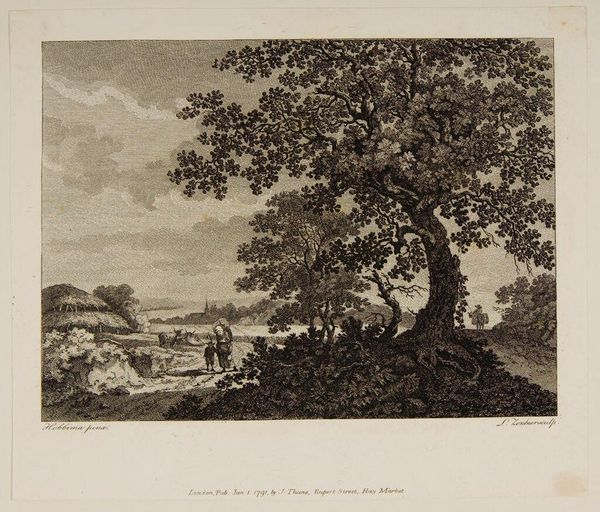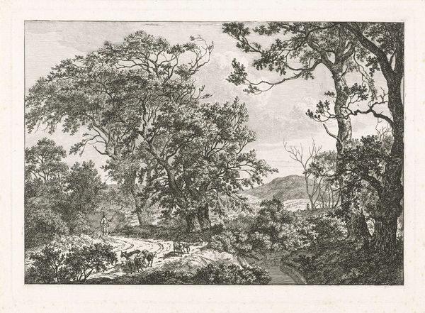 Curator: J. L. L. C. Zentner's piece, entitled "Herdsman Tending Cattle," really captures a particular kind of pastoral scene. Editor: It feels a little… melancholy, no? That gnarled old tree dominates everything, even the sky. Curator: Trees have long served as powerful symbols of life, death, and regeneration across many cultures. Here, it also offers a sense of scale. Editor: Good point! It makes those tiny figures of the herdsman and the cattle seem almost… insignificant against the backdrop of nature. Curator: The image also evokes a sort of timelessness, a visual memory of a way of life connected to the land. Editor: Yes, it definitely makes you think about our place in the world. Very thought-provoking, even with its quiet sadness.