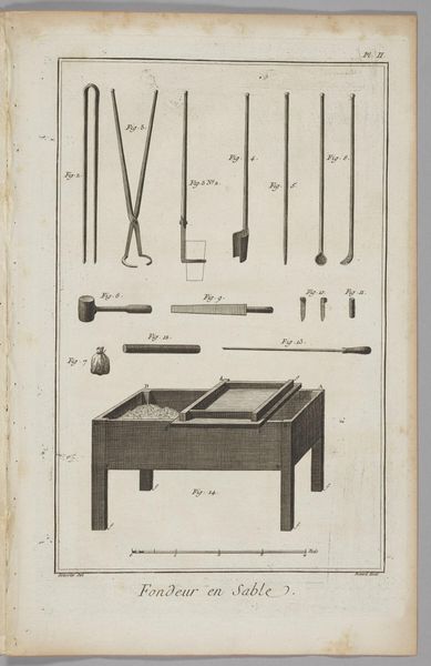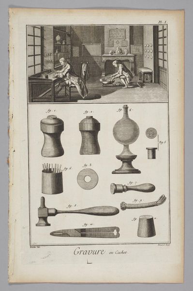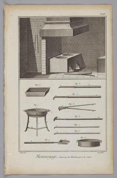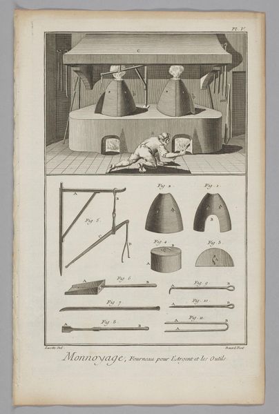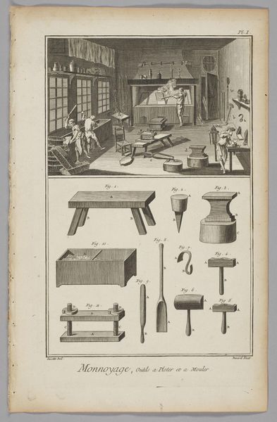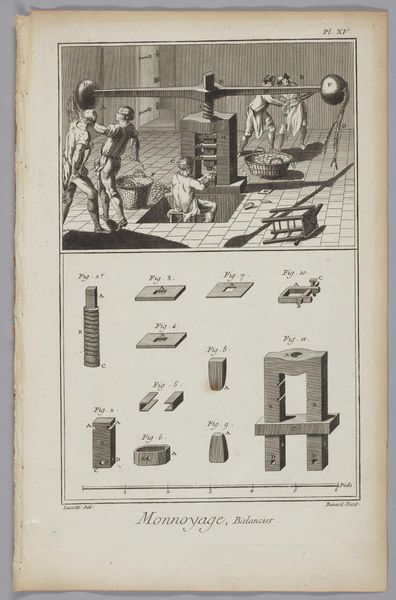 Curator: This engraving by Robert Bénard, titled "Minting, Machine to Stamp Edges," captures a moment in economic history. The detailed depiction of the minting process offers insights into pre-industrial labor. Editor: It's striking how much labor goes into this; you can almost feel the repetitive strain. Curator: Precisely. The image serves not only as documentation but also invites us to consider the human element within systems of production, shedding light on issues of labor, value, and the historical forces that shape them. Editor: It makes you think about accessibility. Who had access to wealth then? I find myself wondering about the social structure implied by the image, and also, the role of the mint worker. Curator: These images circulated widely, democratizing knowledge about crafts and manufacturing. The social implications are layered. Editor: I think engaging with it this way highlights how images can tell stories that touch on historical processes and human experiences, making it relevant to today. Curator: Indeed, the confluence of labor and value depicted here gives us plenty to think about.