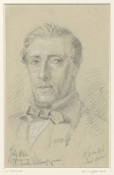 Curator: Oh, this drawing has such a pensive feel. The gentleman almost seems lost in thought, gazing off into the middle distance... like he's pondering a very difficult question! Editor: That's Ferdinand Hart Nibbrig's "Portret van Herman Thomas Karsten", made sometime between 1876 and 1904. It’s a pencil drawing that really captures a specific era. Karsten himself was an urban planner, known for his work in Indonesia. Curator: An urban planner! So maybe he *is* contemplating urban landscapes in his mind’s eye. There’s something so intimate about pencil, isn't there? Like the artist and subject were really having a moment, sharing something beyond the visual. It’s a whisper on paper. Editor: Precisely. Consider the historical context – late 19th, early 20th century – when rapid urbanization and colonial planning were transforming landscapes and social structures. Nibbrig's portrait invites reflection on Karsten's role in these processes. His legacy, and perhaps complicity, are worth considering. Curator: Complicity is a strong word, isn't it? I can’t help but feel some empathy when looking at the marks around his eyes, which maybe tells a story of someone grappling with complex ethical decisions during a time of tremendous cultural upheaval. Or maybe he just wasn’t sleeping well. Editor: Ha! Either is possible, but consider that Karsten’s urban planning had significant impacts on Indonesian communities. He sought to adapt European models, yet, such approaches often disrupted local social structures and displaced indigenous populations. The romantic gaze of the portrait obscures this reality. Curator: Yes, that shadow definitely complicates the way one views this. Still, as a piece of art, its beauty lies in those very shadows. It holds complexities and unspoken questions. A quiet portrait, indeed. Editor: It reminds us to consider art's relationship to history. Beauty can both reveal and conceal uncomfortable truths. Food for thought, certainly.