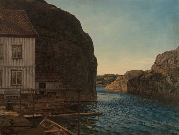 Curator: It evokes such a quiet, contemplative mood, doesn’t it? There’s almost a whisper to the scene. Editor: Yes, I agree. It is quite calming. We’re looking at "Fra Ølvestranden, Hardanger" which translates to “From Ølvestranden, Hardanger," painted in 1863 by Amaldus Nielsen. The work depicts a coastal scene in Norway. Curator: That makes sense. The palette, primarily subdued blues, browns, and grays, contribute to that atmosphere. Look at how the light catches the water; there’s a subtle shimmer created through delicate brushstrokes. Did Nielsen use impasto? Editor: Indeed, you have a keen eye. Close inspection reveals thick applications of oil paint. This was likely done 'en plein air' to capture the immediate effect of the natural light and atmosphere of the Hardanger region. During this period, painting outdoors was growing in popularity. Curator: And, of course, to see the brushstrokes so explicitly lends the work an incredible sense of immediacy. What of that small structure to the right? It is not very developed. Editor: Its rough texture complements the surrounding natural elements: the rugged rocks, the weathered wood and hay on its roof... the fisherman seated in the boat in front. This structure acts as an anchor, drawing our gaze deeper into the vastness of the scene, highlighting both human presence and the dominating scale of nature. Its a testament to life by the sea. Curator: You are right; the size of the nature versus the man is a romantic ideal, that is a popular thing from that period. How art shows us that the culture appreciated its beautiful and harsh environment. Editor: It is certainly a work that allows one to pause. Seeing nature depicted with such directness and the influence of burgeoning artistic approaches leaves a lasting impression. Curator: A captivating synthesis of light, landscape, and the burgeoning plein-air sensibility! Thanks for your input.