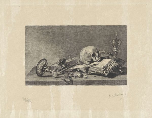 Gerrit van Vucht made this ‘Vanitas Still Life’ with oil on wood, using traditional techniques and materials of the Dutch Golden Age. The smooth application of the oil paint and the rendering of light gives a tactile presence to the objects in the image, emphasizing their material qualities: the rough texture of the old books, the glassy surface of the hourglass, and the smooth appearance of the skull. Still life as a genre was very popular with the rising merchant class. It celebrated the abundance that they enjoyed as traders, but also served as a reminder of the fleeting nature of life, urging them to reflect on death and eternity. The great amount of labor required to create the artwork itself, as well as the objects within, are in stark contrast to the scene's message of the ephemerality of life. The painting challenges the distinction between art and craft, as its meaning is rooted in its materiality, technique, and cultural context, going beyond just surface-level appreciation.