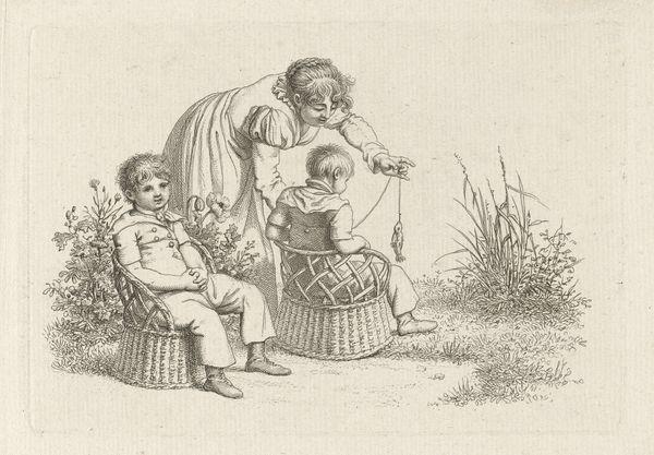 Curator: We’re looking at Jacob Ernst Marcus's "Zittende oude vrouw en twee kinderen" which translates to "Seated old woman and two children". It’s an engraving dating back to 1813. Editor: My first impression is of stillness, almost oppressive. The stark monochrome palette really enhances the sense of weariness etched on their faces. You feel the weight of their situation, especially in the posture of the sleeping woman. Curator: Absolutely. Note the artist’s technical skill in using line and hatching to define form and shadow, it's almost sculptural, particularly in the rendering of the old woman’s draped clothing and weary features. The formal arrangement of figures creates a triangular composition, drawing your eye around the characters in stages. Editor: From a material perspective, the creation of an engraving would involve skilled labor, specialized tools, and printing processes. Paper itself would have been a valuable commodity, and its role in distributing images of working-class figures like this speaks volumes about the dissemination of social commentary at the time. Curator: Interesting point. Consider how the print medium allows for multiple reproductions. Its distribution reaches a wider audience than a unique painting might, allowing for the potential replication of a shared emotional response across different socio-economic levels of Dutch society. Editor: These details – her patched clothing, the bare feet of the boy, and the worn bench are details not typically immortalized in artistic portraiture. They emphasize poverty and lived hardship. Marcus uses art as social commentary by elevating those on the fringes of society, and that’s important to how we understand art production at the time. Curator: Indeed. While not idealized, each figure is treated with dignity. The visual impact transcends mere social documentation, it evokes a palpable empathy. Marcus masterfully manipulated line and form to convey human experience in a complex social fabric. Editor: Looking closely reveals the level of labour involved in image creation, but the subject of the artwork alludes to a whole range of other forms of labour and to class struggle. Overall it’s a potent and compelling representation. Curator: Quite. We begin with lines etched into metal and conclude with lines etched onto faces, each a different method of engraving that tell the human condition in its various states.