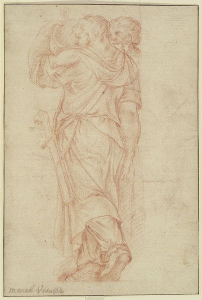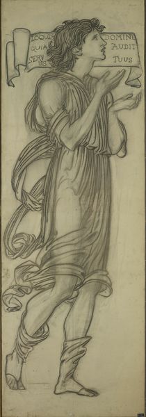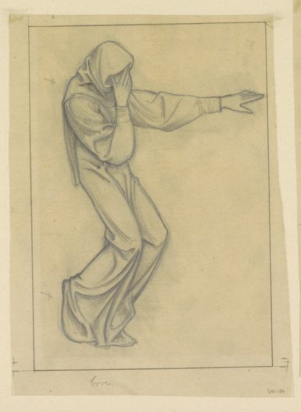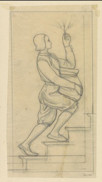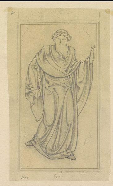 Curator: Here we have "Ontwerp voor wandschildering in de Beurs van Berlage: De Matigheid," a pencil drawing by Antoon Derkinderen created between 1869 and 1925. Editor: My initial impression is of stillness and a sense of restrained power. The figure's pose is simple, but the cascading lines of the drapery add dynamism. Curator: Indeed. Derkinderen clearly references classical iconography here, drawing upon a long history of representing virtues allegorically. The woman pouring from a ewer into a bowl embodies Temperance, or Moderation. The even, controlled flow is paramount. Editor: I see the formal control as well. The halo, though lightly sketched, suggests a contained, spiritual energy. The verticality emphasizes composure and restraint. What do you think of the figure's androgyny? Curator: That’s fascinating! The almost androgynous features suggest a universal, rather than gendered, application of the virtue. This isn’t about feminine meekness or masculine stoicism. It's about a balance that transcends social constructs, essential to any prosperous commercial venture like the Beurs van Berlage. Editor: That makes me reconsider the somewhat bland expression. Perhaps it reflects the sublimation of personal emotion in favor of reason and measured action. It’s about civic duty. Curator: Precisely! Notice how even the act of pouring—something that could be depicted with dramatic flair—is rendered with the utmost control. It suggests the need for self-control within the world of commerce, reminding all involved in financial exchange of fairness and just means. Editor: It also reminds me of Neoplatonic thought, where physical beauty reflects inner harmony and virtue, a kind of moral aesthetics made manifest. I do find the sketch-like nature of the drawing compelling, though. Curator: Me too, and despite it being a study rather than a finished work, the symbol is still powerfully present. It speaks volumes about how social virtues endure. Editor: I’ve certainly developed a greater respect for Derkinderen’s deliberate choices. What appears at first as plain and simple yields quite a wealth of conceptual depth and cultural insight!