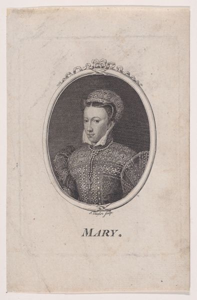 Editor: So here we have Charles Townley’s "Mary, Queen of Scots," an intaglio print from sometime between 1770 and 1799. I'm really struck by the starkness of the image, achieved through the fine lines of the engraving. What can you tell me about it? Curator: Well, it's crucial to look at the materials and the process here. Intaglio prints like this one involved laborious handcraft. The very act of engraving the metal plate emphasizes a transfer of power, almost a mimicking of the socio-political hierarchies that defined Mary’s life and death. The materials used—metal plate, paper, ink—were commodities with their own specific economies. How do you think this medium shapes our understanding of Mary's representation versus, say, an oil painting? Editor: That’s an interesting point. An oil painting, at the time, may have had associations with wealth and power, maybe something almost… unattainable? While this print democratizes her image in a way, making it accessible to a broader audience, it's produced using a reproducible medium? Curator: Precisely! The choice of a print suggests wider distribution, hence the question becomes who was its intended audience? This process isn't neutral. The labor of the engraver, the economics of printmaking, even the distribution networks—all contribute to our reading of Mary's story. Consider how the relatively "mass-produced" nature challenges our idea of art with a capital ‘A’ as opposed to a form of accessible historical artifact. Editor: It’s almost like the medium itself carries a commentary on the social and political climate. Looking at it this way really brings to the forefront the kind of historical narratives made available depending on accessibility of art materials. Thank you. Curator: Absolutely! And seeing the material conditions behind it allows us to question what and whom these portraits served beyond mere visual representations. It gives us agency to read between the lines.