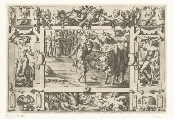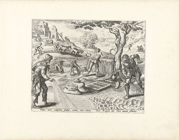 This furnishing fabric, titled "La Noce de Campagne," or "The Country Wedding," was created by Delmès. It presents us with an idealised vision of rural life, rendered in a single colour. We can consider how this image might create meaning through cultural references. The scene it depicts, the ‘country wedding’, evokes a sense of community, tradition, and social harmony. We can ask, what social conditions shaped its production? Was it meant for a specific class or group? Was the image based on real-life events? Was it a comment on social structures? Was it conservative or progressive? Historical sources like letters, diaries, and other documents are valuable. By examining such resources, and the institutions that commissioned and displayed the artwork, we can gain deeper insight into the cultural context and its significance.