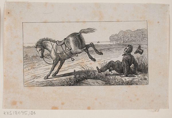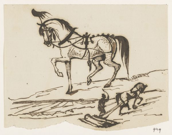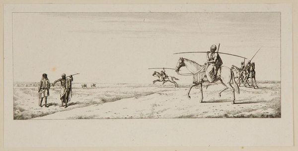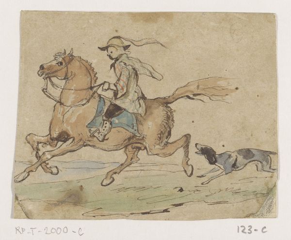 Editor: So this is *Landschap met een ruiter en rennende honden*, or *Landscape with a Rider and Running Dogs*, by Johannes Tavenraat, made with watercolor sometime between 1864 and 1868. It has a sepia tone that lends a distinct feeling of looking at the past. What do you see in this piece, and how does it resonate with you? Curator: What strikes me is the depiction of man’s relationship to animals within a broader landscape, and how that mirrors power structures within society itself. We see the rider, clearly in control, directing the energy of the horse and hounds. Consider the historical context; hunting was often a preserve of the wealthy. Who had the freedom to roam and command these resources, animal and otherwise? Editor: That's a good point. It does make me wonder about the power dynamics represented. Is this merely a depiction of recreation, or is there a more profound comment on social hierarchy? Curator: I would argue that art of this period often naturalizes such hierarchies, presenting them as inherent aspects of life rather than constructed inequalities. This picturesque scene is perhaps more of a commentary on land ownership, privilege and the societal expectation for everyone to be within a certain order of social life. Can you identify other visual cues that reinforce this perspective? Editor: I suppose the way the rider is positioned, above everything, really cements that hierarchy. It also makes you wonder about those not included, right? The figures absent from this landscape. Curator: Precisely. The absences are often as telling as the presences. Who is excluded from this idyllic scene and what does their exclusion tell us about the artist's, and perhaps the viewer’s, social position? Editor: It's interesting to consider art not just for what it shows, but for what it omits. Thank you for this interpretation. Curator: And thank you for prompting such thoughtful questions. Analyzing art with a critical lens makes us interrogate societal norms and dominant narratives that are usually overlooked.