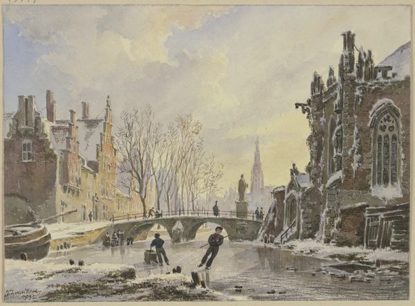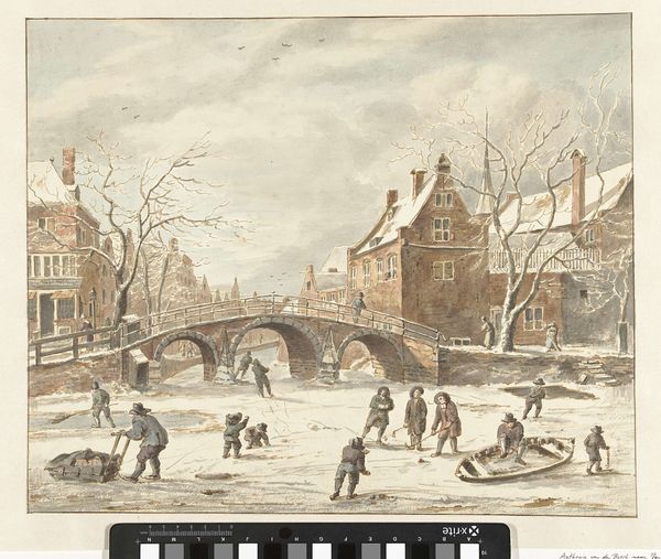 Editor: Here we have Abraham Rademaker's "Snow Falling on a Dutch Town," made between 1685 and 1735. It's a delicate watercolor and pencil drawing on paper, and the muted tones create such a wonderfully serene and quiet winter scene. What strikes you most about this composition? Curator: The structural arrangement is quite compelling. Rademaker has clearly delineated foreground, middle ground, and background through variations in tonal value and the placement of forms. Notice how the darker, more detailed figures in the foreground gradually give way to lighter, less defined shapes in the distance, creating a sense of recession. What do you observe about the use of line? Editor: Well, the lines are very fine and precise, almost delicate, especially in the architectural details of the buildings. They define the forms clearly, yet subtly. Curator: Precisely. This precise application of line, combined with the layering of watercolor washes, builds depth while maintaining a consistent level of textural variation. Rademaker utilizes line to generate the architectural rigidity, as compared to the amorphous construction of snow, in the environment. Editor: So, it’s the contrast between the structured linework and the soft washes that creates this sense of depth and atmospheric perspective? It almost feels photographic, given the focus and falloff. Curator: One could argue that his choice of materials—pencil and watercolor on paper—also informs its reading. A different medium might generate vastly different affects or disrupt its structural composure. Consider the subtle nuances in texture, from the crispness of the architectural details to the soft diffusion of the snow. Do you find this as compelling as I do? Editor: I hadn’t considered the role of materials so deeply before. Thinking about how each artistic choice contributes to the overall structure clarifies its elegance. Curator: Indeed, an attention to structure grants an even more profound appreciation.