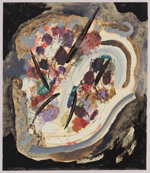 Curator: Robert Ericksen's "War-torn," at just over 60 centimeters square, presents a visceral response to conflict. Editor: It's immediately striking—a chaotic vortex of dark hues punctuated by flashes of red and green. Very unsettling. Curator: Ericksen painted this during a time when abstract expressionism offered artists a new visual vocabulary to express the trauma and anxieties of the post-war period. Editor: The eye is drawn to the swirling composition, the way forms bleed into one another. The artist's use of line and color almost mimics the destructive energy of war itself. Curator: I think its power lies in its refusal to depict specific events. Instead, it grapples with the psychological impact of widespread violence on the collective consciousness. Editor: The lack of grounding, the floating elements, contribute to a sense of disorientation. It doesn't offer resolution. Curator: Perhaps that is because there is no easy resolution to the trauma of war. Editor: An important reminder. It will stay with me.