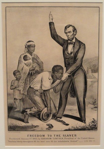 Editor: This is "Free!" by Henry Louis Stephens. The print shows a formerly enslaved man with his arms raised in triumph. The figure's dynamic pose and the word "Free!" printed at the bottom certainly evoke a powerful sense of liberation. What do you see in this piece? Curator: The composition strikes me as particularly compelling. Notice the juxtaposition of the figure against the backdrop of both a Union encampment on the left and what appears to be a plantation landscape to the right. Stephens uses these visual elements to create a binary; the tension between slavery and freedom is articulated through spatial arrangement. Editor: That makes sense. So, the formal elements create a visual argument? Curator: Precisely. The artist uses contrasting visual vocabularies to speak to larger ideological conflicts. The figure’s muscularity and upward gaze enhance the formal elements. Editor: That's such a helpful way to understand how the artist is thinking. Thanks!