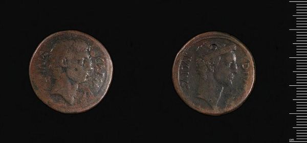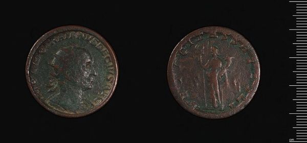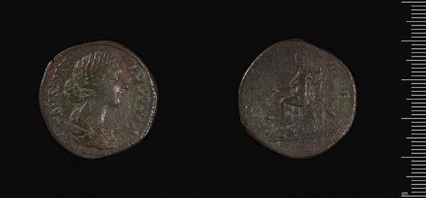 Curator: This is a sestertius, a Roman coin, actually crafted during the reign of Antoninus Pius. The material is quite fascinating, you can see the wear. Editor: Immediately, I sense the weight of empire, both literally—at 24.58 grams—and figuratively. The figure on one side seems to embody power structures of the time. Curator: Indeed. Examining the material composition and the process of minting these coins gives us insight into the economic and social structures of Roman society. Editor: Precisely! It’s a lens through which we can examine the cultural values and beliefs of the time, and consider how those systems perpetuated power. Curator: It's remarkable how objects like these—tools of exchange and power—reflect the skill of craftspeople involved. Editor: And how they shaped perceptions and reinforced hierarchies—a tangible echo of past ideologies. I leave contemplating the enduring echoes of power.