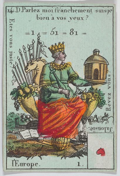 This anonymous, undated playing card from "Costumes des Peuples Étrangers" depicts a native of Easter Island holding a club. The club is a dominant visual symbol, an immediate assertion of power and defense. This motif is deeply resonant, echoing clubs wielded by Hercules, the classical hero whose strength and struggles were immortalized in art across millennia. The club, in its crude form, evokes primal human instincts—survival, dominance, and confrontation. This is not merely a practical tool; it is a scepter of authority. The image prompts a psychoanalytic interpretation: the club becomes a phallic symbol, representing not only physical power, but also a latent assertion of cultural dominance by the colonizer. The card reflects the complex psychology of cultural encounter, layered with fear, fascination, and a subconscious desire for control. The symbol transcends the immediate depiction, becoming a vessel for historical and psychological undercurrents. It reappears across time, each instance reshaping its significance while retaining echoes of its primal origins.