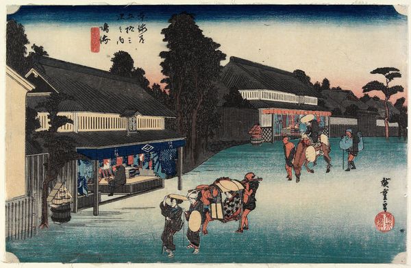 Editor: We’re looking at Utagawa Hiroshige’s woodblock print, “No. Ishibe,” created between 1847 and 1852. The use of color feels so unique, capturing what appears to be a bustling town with muted, almost dreamlike, qualities. What stands out to you in its composition? Curator: Observe the receding planes; how Hiroshige organizes the image. See how the artist directs our vision from the bottom right foreground to the back using linear perspective. Note also that, counter to Western formal techniques, the artist positions the horizon at roughly eye level. The use of symmetry in the architecture is not absolute. The entire print exhibits a planar flattening due to a high horizon, where the foreground and background appear nearly aligned. How might this impact your perception? Editor: It flattens the scene, making it feel less like a realistic landscape and more like a snapshot of a moment, maybe heightening the sense of artificiality you were mentioning. Curator: Precisely. Note the compositional structure produced by lines; not only are we provided the architectural lines from houses, yet also diagonal lines converging to one spot in the image that organizes movement, leading our eyes to see the interaction between people and their setting, thus reflecting their emotional states. Editor: That’s fascinating. I was so drawn to the dreamy palette. Curator: Consider the formal organization. Color is secondary to line and placement of design, creating visual rhythm through the tonal consistency between objects such as lanterns and building that unify pictorial space and creating a visual harmony. Editor: It makes you consider how important the physical arrangement is rather than just being distracted by the colors. I’ll definitely look at prints differently now. Curator: Hopefully, you begin to see that it’s not what’s depicted, but rather how form produces visual space.