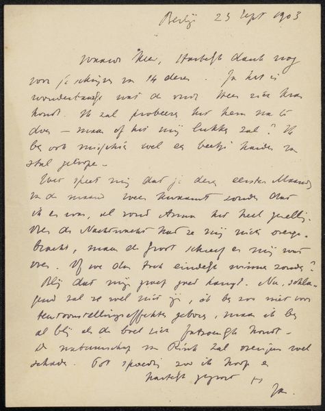 Curator: This is "Brief aan C.C. Delprat" by Jan Veth, possibly created between 1922 and 1924. It's currently held at the Rijksmuseum. The medium is ink on paper—a simple yet intimate choice. What strikes you about it? Editor: There's a palpable sense of immediacy, almost as if you've just stumbled upon a private correspondence. The handwriting, the slight imperfections...it feels very personal, immediate, a real window into a moment. Curator: Precisely. Veth, known for his portraits and involvement in the Dutch art scene, chooses here to share his thoughts through the very personal medium of a handwritten letter. Considering the date, this form of communication itself speaks to the social context. No emails here! Editor: Right, no digital filter. It seems almost nostalgic for us. Tell me more about the recipient and how this fits into the broader social history of art and artist networks. Curator: C.C. Delprat was, as the letter suggests, likely a close associate, maybe even a confidant, considering the casual tone. What we can consider through an intersectional lens is how correspondence like this shapes the narrative of artistic collaboration and intellectual exchange. It unveils relationships often overshadowed by the final artwork. Editor: The “intimism” tag feels incredibly apt here, even beyond the visual characteristics. You are really given a sense of eavesdropping. The content itself feels almost secondary to the *act* of intimate sharing. Curator: Yes, Veth's careful rendering of this brief personal communication acts like a symbolic gesture of solidarity between two colleagues and provides insight into his role within that framework of a very particular elite intellectual circle in the Netherlands during that period. Editor: It's a fascinating reminder that art exists within social and interpersonal relationships. Looking closer reveals more layers beyond just medium and date. Thanks to Veth, we have access to consider art beyond only galleries or collections. Curator: It truly does invite us to consider the narratives intertwined within art history that challenge more traditional views of art production. It allows us a look behind the scenes, so to speak, Editor: Exactly, it emphasizes the web of interactions. Curator: Absolutely. A simple letter transforms into something much more potent with scrutiny.