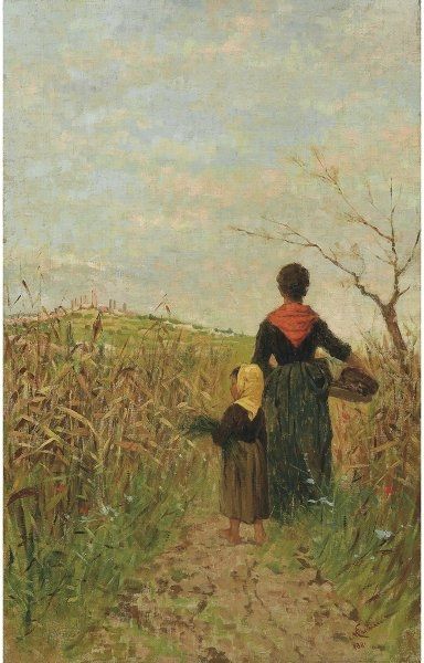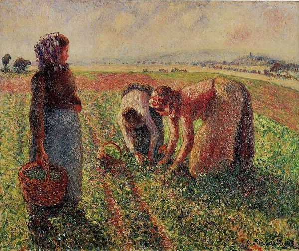 Camille Pissarro painted "Peasant Woman Carrying a Basket" in 1888. Notice how the pointillist technique lends a hazy, dreamlike quality to this depiction of rural life. Pissarro constructs the scene through small dabs of colour, building form and depth with a mosaic-like structure. The figures of the peasant women are integrated within the landscape, becoming part of the fields and sky through a consistent application of brushstrokes. The composition lacks a strong central focus, suggesting a democratic view where no element dominates; each contributes equally to the whole. This approach mirrors contemporary philosophical ideas about the interconnectedness of individuals and their environment. Consider how Pissarro challenges traditional notions of perspective and form through this technique. The dissolution of solid forms into a field of colour destabilizes conventional hierarchies of representation. This reflects a broader modernist project to question established systems of seeing and understanding the world, inviting us to reconsider our own perceptions and assumptions.