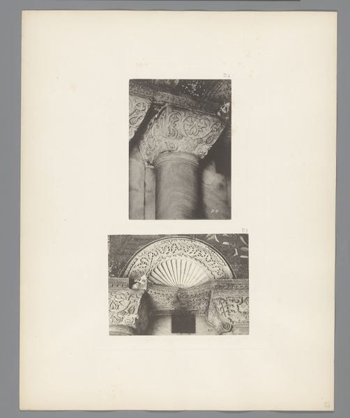 Curator: Let’s explore this photographic print from before 1885 by Carl Heinrich Jacobi: "Twee afbeeldingen van kapitelen en details van de San Marco in Venetië.” Editor: The details in these close-up shots of the capitals in Venice's San Marco are pretty intricate. I’m initially drawn to the juxtaposition of the almost clinical, photographic style with the ornate, historical details of the architecture. How do you interpret this work in relation to its time? Curator: The very act of photographing architectural details like this during that period has profound implications. It's about more than documentation. Consider how Venice, as a historical crossroads, was being re-imagined and, in some ways, commodified for the rising tourist industry. The photograph attempts to freeze and preserve aspects of Venetian identity as the city changes due to modernization and colonialism. To what extent does this type of selective framing also shape narratives of power, tradition and exclusion? Editor: That's fascinating. I hadn't considered the power dynamics at play. I was focusing more on the aesthetic contrast, but what you’re saying situates the piece in a larger sociopolitical context. Does Jacobi's choice of focus contribute to a kind of curated historical narrative? Curator: Precisely! Jacobi's photographs weren’t created in a vacuum. They intersect with broader currents concerning cultural preservation, identity construction, and the marketing of "authentic" historical experiences, then and now. They become a lens through which certain stories are amplified, while others are suppressed. Editor: That really shifts how I see this. It's not just about appreciating the architectural detail, but about questioning who gets to define and present that history. Thank you for shedding light on the sociopolitical context. Curator: Absolutely! Always consider the lens through which we view history and whose story it serves.