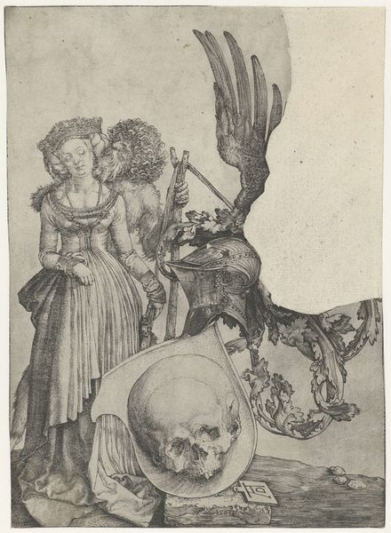 Curator: Here we have “Kind met drie schedels,” or “Child with Three Skulls.” Created sometime between 1529 and 1590 by an anonymous artist, it's a fascinating example of a drawing rendered in pencil and ink on toned paper. Editor: My first impression is of melancholy. It’s unsettling to see that contrast between youth, symbolized by the child, and mortality, emphasized by the skulls and that hourglass in the background, reminding us of fleeting time. Curator: Exactly. The work presents the child figure juxtaposed with death itself. The gaze is heavy. You can almost imagine a commentary on power structures of the time where life, even at its most precious and vulnerable, is so heavily burdened. Editor: And there’s the texture of it all. The different weights of line used create incredible depth despite the medium’s inherent limitations. Look at how the bones seem scattered; almost as though one swept all this material together, with varying grades of quality suggesting layers upon layers of production and labor…even the preparation of the paper. Curator: You are spot on to consider the materiality. The starkness emphasizes a certain fatalism that was so ever present in considerations of faith and philosophy during that time. One is left wondering, what expectations, what burdens did people place on childhood? This is complicated, isn't it? Editor: It really is. And the composition pulls you in as the details slowly come into focus. What appeared chaotic suddenly has purpose, as the pen and pencil strokes have brought these images into life with precision, which brings the material reality into stark relief against the metaphor of the images of death and innocence. Curator: Reflecting on “Kind met drie schedels” truly pushes us to consider how artists were, and continue to be, commenting on identity through materials readily available to them while simultaneously commenting on the temporal. Editor: It prompts a deep consideration of art production, materiality, and how those informed the final artwork in its time and continuing legacy. An anonymous artist, reminding us perhaps of how the individual and its labor matters when stacked up against a collective cultural legacy.