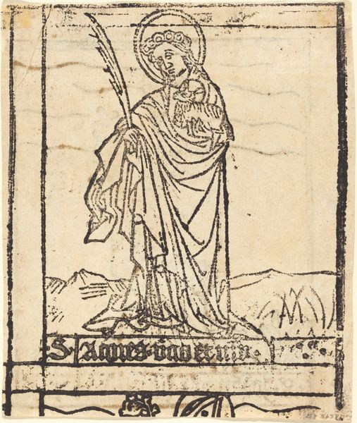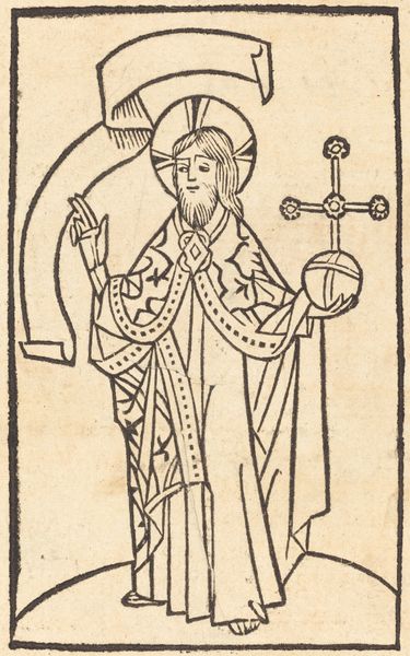 Curator: I'm struck immediately by the stark simplicity of the lines, like something found in an ancient storybook, the kind with ominous undertones. What do you think? Editor: Indeed! And this woodcut is attributed to Sebald Beham. The work, "Saint Erasmus as Bishop," presents a fascinating image of a saint who suffered a rather gruesome martyrdom. Notice the details of his vestments, and the environment that surrounds him: Sebald Beham shows the scene with incredible economy! Curator: It does have a storybook feel! And thinking of poor Erasmus now, those are not just decorative items, they speak to something… ominous? The composition looks almost naively drawn, and gives it, I think, an archaic flavor. The mountains there in the background... I see childhood memories mixing with iconography! Editor: Precisely, but childhood memories through the lens of faith, of course! The very limited tonal range and line work give him a quiet monumentality. And notice, to one side of Erasmus we see a twisted, somewhat primitive rendition of an object that appears to be his attribute: a windlass! It was, according to his legend, with this very device that his bowels were extracted! Curator: Ah, well there's the grim undertone confirmed! It's a bit terrifying to see something so awful presented so plainly, really. And I guess it says something about resilience to look to a saint who faced a terrible ordeal. I’d be likely hiding if that ever happened to me! Editor: The power of faith. As well, remember this piece would have existed in a culture utterly steeped in religious stories and, indeed, often violent imagery! A collective visual literacy shaped by the church. Beham really understood this! The bishop's imposing posture, the symbols... Curator: Gives one a lot to think about. I initially took in that pastoral scenery in the background and got such a comfortable feeling, while now I wonder whether something menacing is implied, something I can't shake anymore! Editor: A true convergence of artistic skill and cultural narrative then. I will be certain to remember "Saint Erasmus as Bishop" as one of Sebald Beham's pieces with very unsettling contrasts! Curator: It will certainly change the way I daydream among nature scenes! Now excuse me while I go ruminate on bowels being wound from torsos, and how to reconcile that with pleasant mountains...