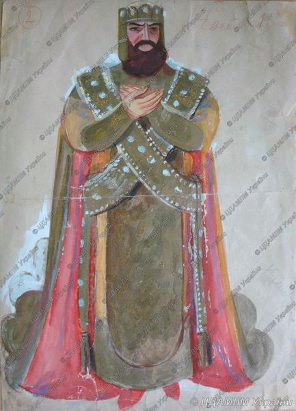 Curator: This intriguing artwork, titled "Igor", is attributed to Nicholas Roerich. It’s a sketch, likely created using watercolor and drawing techniques, showcasing a richly adorned figure. Editor: It’s vibrant! The texture implied by the layered details is compelling; you immediately get a sense of opulence. Look at the pattern on that robe. Curator: Roerich was deeply involved in stage design. I suspect that we're observing a costume design, maybe for an opera or play. The cultural influences are intriguing too; it resembles some asian motifs and costume history traditions, likely related to specific performance traditions or cultural storytelling of its period. Editor: Yes, there is almost a childlike "naive art" aspect in how those repeating patterns are made. Observe the silver armor and red shield - there is a striking interplay. Notice the verticality achieved through the spear and helmet. This creates visual dominance. Curator: It reflects his interests in folklore and ancient cultures, certainly. Costume design became a crucial element in nationalistic expression across Europe from the 19th century forward. Many sought to visualize and celebrate historic roots on stage, contributing to national identities and collective memories. Editor: The drawing-like quality emphasizes linearity, especially in outlining forms; for instance, that red shield is merely suggested. Do you think this imprecision helps convey movement? Curator: I think the use of line suggests less of realism, more of a stylistic presentation suited for immediate recognition, in theater perhaps? To see Roerich's artwork situated on stage in a theater is vital. This perspective shapes one’s viewing and its significance. Editor: A fresh, invigorating, visual reminder of design innovation from Roerich. Curator: Yes, a vibrant glimpse into a theatrical past. It emphasizes the interwoven nature between art, history and performing art culture.