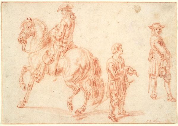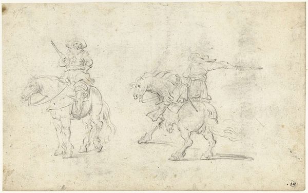 Curator: What strikes me first is the quiet, almost meditative mood of this study. It's intimate, like a stolen glance into the artist's sketchbook. Editor: Indeed. We’re looking at a drawing titled "A Peasant on Horseback seen in Profile Facing Right; Two Studies of the Same Man's Head," by Stefano della Bella. Della Bella, who was active in the 17th century, around 1610 to 1664. It’s a combination of etching, graphite, and pencil on paper, currently residing here at the Metropolitan Museum of Art. The piece beautifully captures the genre-painting tradition with landscape elements of Baroque style through several different kinds of medium. Curator: Baroque meets snapshot, wouldn't you say? Look at how he plays with line weight – the horse is barely there, almost ethereal, yet the peasant's face, in those separate studies, has such depth. It’s like he’s searching for something, some inner truth of this working man. Editor: His rapid sketches are quite revealing about Baroque artistic interests. During this era, the common person rose to the spotlight. Although history has many records about the powerful elites during the era, more artwork featured middle-class merchants, religious zealots and common folk as popular art subjects. It gave artists like Stefano a chance to exercise social awareness. Curator: Social awareness, yes, but also a certain…tenderness? There's nothing grand or imposing about this piece. It feels honest, a fleeting moment immortalized on paper. He wasn't glorifying, just observing. Editor: And distributing those observations, we should note. Printmaking allowed these more intimate scenes, these slices of everyday life, to circulate in a way paintings simply couldn’t. The medium itself democratizes the image. The Metropolitan acquiring it only further immortalizes this work of genius. Curator: Precisely. And to think, centuries later, we are still captivated by a simple sketch of a peasant on horseback! Isn’t that just magical? Editor: It speaks to the power of observation, of truly seeing, doesn’t it? And of course, of the institutions that keep that vision alive.