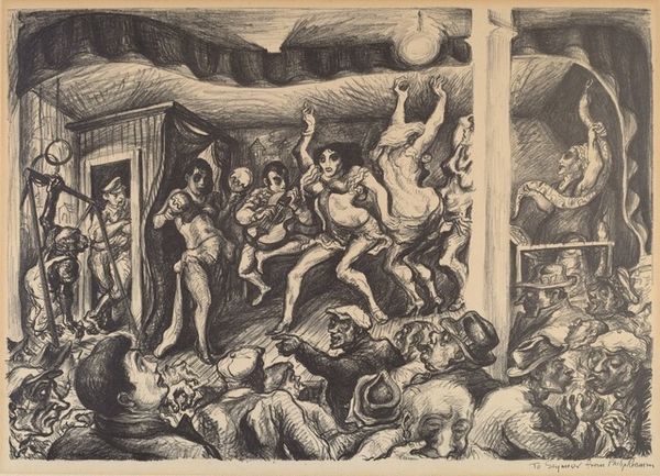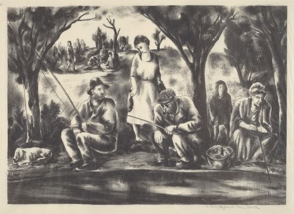 This is John Steuart Curry’s 1932 lithograph, "The Tornado". It's a small print, rendered in black and white. You can really see the mark-making. It’s all about hatching and cross-hatching to build up the form; there’s very little blending. The texture comes from the density of lines, a tight scribble to describe the churning sky and the looming tornado, with a looser touch for the buildings and figures. The shading is used to create depth, but also to emphasize the figures’ anxiety. Look at the mother's face, her eyes wide with fear, and the rigid lines around her mouth. The figures almost seem frozen. The tornado itself is treated like a character. You see its power in the way the lines are clustered and concentrated. This print makes me think of Kathe Kollwitz, especially the way both artists use the language of printmaking to express human emotion. Both artists embrace the messiness and immediacy of their chosen medium. It’s not about perfection, it’s about feeling.