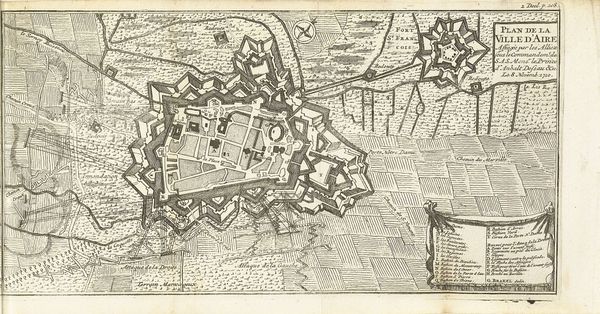 This is Gaspar Bouttats’s etching of Woerden, made sometime around 1672, now held in the Rijksmuseum. The dominant visual element here is the geometric pattern of the town’s layout, neatly encased within its defensive star-shaped walls. The town’s structures are rendered as a series of linear forms, creating a microcosm of order and containment. The map's formal structure goes beyond simple representation; it's a statement about control and power. The rigid lines and precise angles of the fortifications speak to a desire to impose order on both space and society. In semiotic terms, the town becomes a sign, its visual components encoding messages about military strategy, urban planning, and social organization. Consider how the map itself functions as a tool, not just for navigation, but also for asserting dominance. It presents a world neatly categorized and controlled, a vision that reflects the broader philosophical concerns of the time. The map is more than an image; it's an embodiment of a worldview, inviting ongoing interpretation within our cultural and historical understanding.