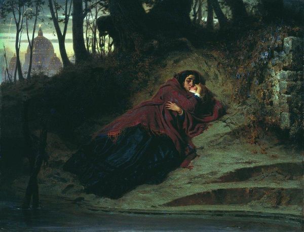 Editor: This is "A Young Peasant Girl Sleeping," an oil painting by Léon Bazile Perrault, created in 1874. I’m immediately drawn to how meticulously the artist renders the texture of the hay she's lying on. What details strike you as significant? Curator: As a materialist, I’m interested in the raw materials and the labour that informs the painting's very existence. Think about the pigments Perrault would have used – where did they come from? How were they processed? The red of her dress, for example, or the subtle earth tones. And consider the sickle; it’s a tool, of course, but it also speaks to the backbreaking agricultural labor prevalent in 19th century France. It grounds the idyllic scene in the reality of peasant life. Editor: So, the painting is both idealized and rooted in material reality? Curator: Exactly. The artist meticulously depicts not only the scene but, using these materials, is documenting how labour is romanticized even while those raw materials have come to fruition through labour. The composition positions her beauty and repose centrally to mask any overt signs of fatigue from agricultural work, wouldn’t you agree? Editor: I do! Thinking about the labor and materials certainly changes my perspective. The way the materials become this almost dreamy image— it’s more complex than I initially thought. Curator: Precisely. The artist wants the viewers to see this image through the labour the model might perform to enjoy even the simplest leisure afforded. It asks what these objects cost. Editor: This conversation has broadened my understanding. I never really considered how material analysis can add meaning to art! Curator: And hopefully, consider the means by which these materials continue to impact lives of labourers around the world.