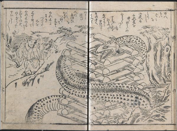 Curator: Before us we have Tachibana Gado’s *The Night Parade of One Hundred Demons*, a drawing from 1892 rendered with ink and colored pencil. What are your initial impressions? Editor: A riot of form and color! There’s something carnivalesque about it, and simultaneously unsettling. These figures...they feel ancient, pulled from the depths of collective memory. Curator: It’s a marvelous glimpse into Japanese folklore, wouldn’t you agree? Look closely at how Gado has applied the coloured pencil. What does that evoke to you? Editor: Absolutely. When you focus on the texture, you start to realize that there are numerous creatures here, almost playfully composed with an aesthetic rooted in *ukiyo-e*. I am struck by how accessible it makes the otherworldly. You see an engagement with class and status. Curator: Yes, very perceptive! What do you mean? Editor: The depiction of the demons—these are not noble spirits or gods. These are the disgruntled, the marginalized. It almost functions as a social critique. Demons riding tortoises – it speaks to the inversion of the status quo, the temporary breakdown of hierarchies. Curator: An interesting way of seeing the procession through social strata... I wonder, considering Gado's position at the time, do you feel he was advocating, perhaps subtly, for a similar unraveling? Editor: It's tough to say definitively with the limited historical material available on him, isn't it? Art never exists in a vacuum though – we have to understand the socio-political context that informs Gado’s worldview. In the Meiji era there was increasing emphasis on modernization at the expense of some traditional elements. Was the intention just observation? Critique? A lament? Perhaps a bit of everything. Curator: A cultural snapshot of shifting values. Well, whatever the purpose, Gado certainly provides an intriguing insight into a fascinating mythological tapestry, rendered through tangible materials. Editor: I agree. I feel a strange kind of resonance looking at this, especially the depiction of creatures seemingly abandoned to their own chaotic devices.