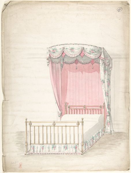 Editor: Here we have a drawing of a Gothic Style Chair, likely from the 19th century. It's made with coloured pencil, watercolour, and print. The muted pink and beige tones give it a strangely delicate yet stately feel. What do you see in this piece? Curator: Ah, this chair! It whispers stories of power and romance to me. Can't you just imagine a medieval queen perched there, planning her next chess move, or maybe a swooning heroine in a gothic novel? Notice how the artist plays with detail. The filigree almost dances, doesn't it? Do you get the sense that the chair is a little impractical? Editor: Absolutely! All those tassels. I can imagine tripping on them. So, is it more about the *idea* of Gothic than actual function? Curator: Exactly! It's Romanticism's take on the Gothic. Not a perfectly historically accurate rendering but an emotional resonance. I like to imagine it’s a set piece from a stage production of someone's imaginings of courtly life. Did that emotional impression come through to you before or is that something that resonates with your understanding? Editor: Honestly, I was just thinking about tassels and practicality. Now I see the whole stage! I do wonder who made this? Was it a furniture maker preparing a design? Curator: Perhaps! Someone with both an eye for craft, a flair for design and who indulged in imagination. And the muted colours— the sensibility has given us a different interpretation of history. A wistful, dreamlike kind of recollection that feels more modern, even to this day. Editor: That makes total sense. It’s less about recreating the past and more about how the past lives in our imagination. Thanks! Curator: The pleasure was mine! I'll never look at a drawing of furniture the same way again.