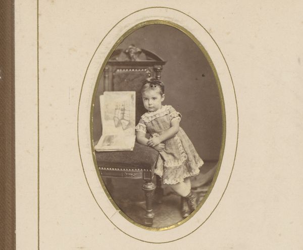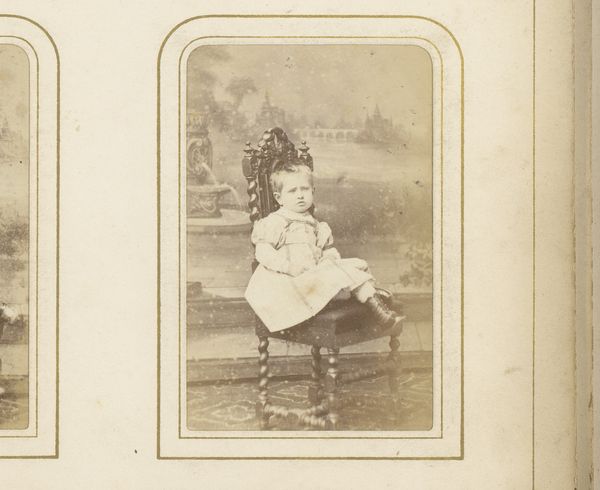 This is a photograph titled 'Portret van een meisje in kinderstoel', made by Johannes Ephraim. The portrait offers us a glimpse into the constructed world of childhood in the late 19th century. Photography, in its relative infancy, was becoming a tool for documenting and idealizing domestic life, particularly the image of children. This little girl, perched in her wicker chair, is carefully styled, from her frilly dress to her sturdy boots. Consider how gender and class intersect in this image. The child’s clothing speaks to a certain level of affluence, while her pose and attire reflect the era’s expectations of feminine daintiness, even in girlhood. But there's also a tension in her gaze, a hint of rebellion perhaps, against the constraints of representation. This tension reminds us that photographs are never neutral records; they are carefully constructed narratives reflecting both societal norms and individual expression. It evokes questions of identity and resistance, as the girl embodies both conformity and a quiet, defiant individuality.