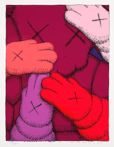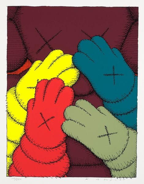 Curator: Let's consider Kaws' "Urge #3," a mixed-media piece from 2020 blending collage and screenprint techniques. Editor: It’s immediately striking – a huddle of brightly colored cartoon hands. I’m drawn to the tactile quality, emphasized by those stark, stitched outlines. Curator: Yes, that almost crude stitching becomes a kind of framing device. Consider Kaws’ background in street art and his savvy transition into the gallery world. He bridges high and low culture, using pop-art imagery to engage a broad audience. This work reflects the commodification of emotion, distilling complex feelings into these simplified forms. Editor: I see what you mean, yet the interplay of those flattened hands is intriguing on a purely compositional level. The overlapping shapes and color choices—the red, green, blue—create visual tension, a strange balance. And what of the hands themselves—they’re oddly unsettling. They feel both comforting, in their huddle, and threatening, their button eyes replaced by X’s. Curator: Indeed, Kaws is a master of emotional ambiguity. These familiar cartoon tropes are twisted, hinting at a darker undercurrent. His work asks us to confront our own emotional landscape within the context of consumer culture, often blurring the lines between genuine feeling and manufactured sentiment. The "X" motif replacing the eyes is a consistent theme in his art. This can be seen as a commentary on cultural blind spots. Editor: Blind spots indeed. There's something disquieting in their blankness, their sheer lack of expressivity, considering the warmth typically expected from the huddle of hands. It almost evokes a kind of manufactured empathy that’s meant to feel safe but really just rings hollow. Curator: And the edition size too, of 250 prints, that makes a statement. The artist is acknowledging, but also leaning into, the demands and constraints of the art market. The collectability of an “original” piece, the idea of the readymade in art are being subverted even within a gallery print. Editor: It certainly invites you to ponder those issues. Curator: Thinking about "Urge #3" now, I find its social commentary even more potent. Editor: For me, I am newly aware of Kaws’ distinctive formal language—a tension of line, form and void that I can take with me to reflect on similar artworks.