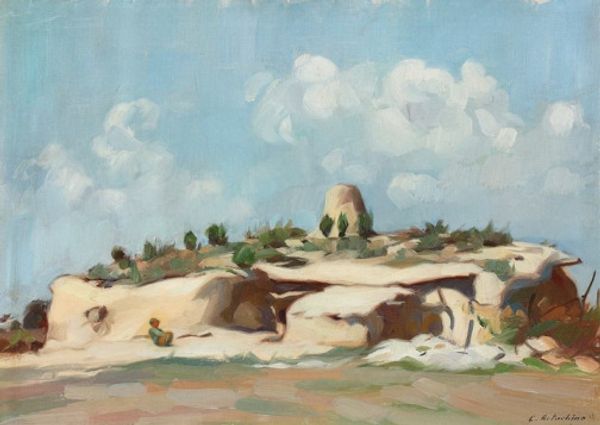 Yeghishe Tadevosyan painted this small oil sketch of Saint Hripsime Church in Etchmiadzin, Armenia, sometime in the early 20th century. It's all about process, you can tell Tadevosyan is thinking through the scene, not trying to copy it. The paint is applied directly, in visible strokes, creating a surface that’s alive with texture. Look at the way he’s built up the ochre and umber tones of the church walls, layering warm and cool shades to suggest the play of light. It’s so tactile, like you could reach out and feel the rough stone. I love how he’s used these little dashes of green to suggest vegetation, it’s so immediate. Notice the sky, though, how that’s a smooth, pale blue – it’s a totally different feel. And yet it really sets off the building. Tadevosyan’s work reminds me a bit of Cezanne, that same interest in the weight and volume of things, the same commitment to painting as a way of seeing. But of course, Tadevosyan brings his own perspective, his own sense of place. For him, art isn't just about depicting a scene; it's about capturing a feeling, a sense of being in the world.